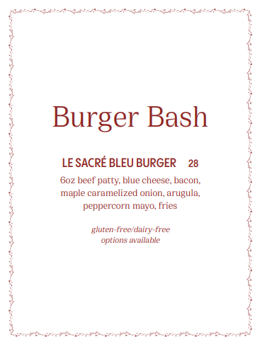The Le Sacré Bleu Burger features a 6 oz beef patty topped with blue cheese, bacon, maple caramelized onions, arugula, and peppercorn mayo, served with fries.