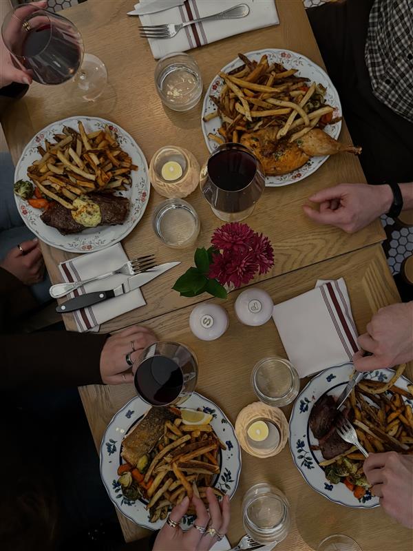 Choose your protein, sirloin, striploin with Béarnaise, half chicken, or seared salmon, each served with crisp frites and dijonnaise. And yes… the frites keep coming, just when you think you’re done.